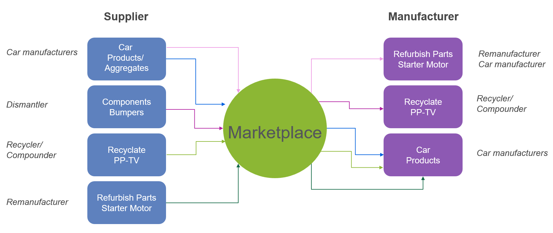 All in all, this means that the primary problem in creating circularity, especially in the automotive industry, which is already heavily regulated by legal requirements, is a communication problem. For this reason, it seems not only sensible but also necessary to create a communication platform where the various offers and requests of market participants can be exchanged.